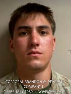 February 2, 1989 – November 2010,Corporal BRANDON W. PEARSON was born on 2 February 1989 in Arvada, Colorado. He attended Ralston Valley High School, enlisted in the Marine Corps two days after Christmas in 2006, and left for recruit training on 4 September 2007. As Private Pearson, he graduated from Recruit Training in November 2007 and then checked into School of Infantry – West. He became a rifleman and was promoted to Private First Class, assigned to Company L, 3rd Battalion, 5th Marines. On 1 November 2008 he was promoted to Lance Corporal. While assigned to Company L, he completed a summer and winter package at Mountain Warfare Training Center in Bridgeport, California, as well as completing Mojave Viper Training at 29 Palms, California in preparation for deployment to Afghanistan. Lance Corporal Pearson was deployed to Okinawa, Japan with the 31st Marine Expeditionary Unit, where he participated in partnered bilateral training with Thailand, South Korea, Philippines, and Australia. He served as the 1st team leader, 2nd Squad, 2nd Platoon while deployed to Afghanistan in support of Operation Enduring Free-dom. Corporal Pearson’s personal awards include the Purple Heart and Combat Action Ribbon.