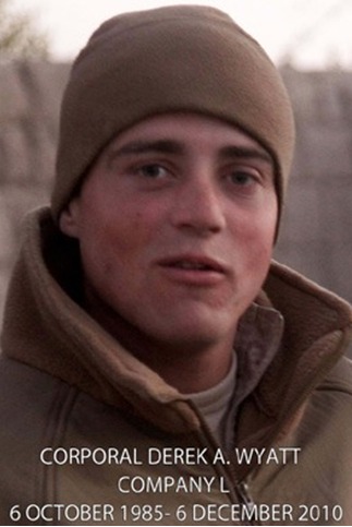 Corporal DEREK A. WYATT was born on 6 October 1985 in Canton, Ohio. He grew up in Akron, where he attended Seiberling Elementary School and Goodyear Middle School. In June 2004 Corporal Wyatt graduated from Akron East High School and enlisted in the Marine Corps two months later. He attended Recruit Training in Parris Island, South Carolina and subsequently attended the School of Infantry – East, where he graduated as a rifleman. Corporal Wyatt then attended Basic Security Guard School in Chesapeake Bay, Virginia. After graduation he was assigned to Marine Corps Barracks 8th & I in Washington, D.C. Shortly thereafter he served at the White House Communications Agency. In July 2007 he was transferred to the Headquarters and Service Battalion, 3rd Marine Division in Okinawa, Japan. In February 2009 he was transferred to Company I, 3rd Battalion, 5th Marines, where he deployed as part of the 31st Marine Expeditionary Unit to Okinawa. He was part of the 1st Platoon and held the billet of Team Leader. Corporal Wyatt’s personal awards include the Purple Heart and Combat Action Ribbon.