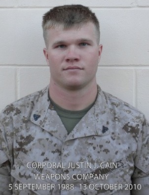 Corporal JUSTIN J. CAIN was born in Manitowoc, Wisconsin on 5 September 1988. In 2007 he graduated from Lincoln High School and almost immediately enlisted in the Marine Corps. He shipped out to the Recruit Depot on 19 June. After graduation Corporal Cain was sent to the School of Infantry – West, where he became a machine gunner. He was then sent to Weapons Company, 2nd Battalion, 5th Marines and was part of the Battalion Landing Team for the 31st Marine Expeditionary Unit from August 2009 to Jan-uary 2010. Corporal Cain was then transferred to Weapons Company, 3rd Battalion, 5th Marines. He deployed with Combined Anti-Armor Team I, 1st Section, to Sangin District in Afghanistan in support of Operation Enduring Freedom. His personal awards include the Purple Heart and Combat Action Ribbon. Corporal Cain is survived by his parents, James Cain and Judith Luckow, and his sisters Jolene Cain-Garcia and Jeanne Cain.