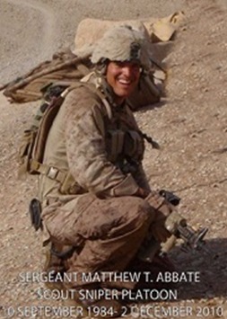 Sgt. Matthew T. Abbate of Honolulu, Hawaii, formerly of Fresno, California, attended Buchanan High School in Clovis before graduating from Sierra Charter School in Clovis. He enlisted in the Marine Corps on February 1, 2006 and was serving his second combat deployment. His awards include the Navy Cross, Purple Heart, Combat Action Ribbon, Navy and Marine Achievement Medal, National Defense Service Medal, Global War on Terrorism Service Medal, Marine Corps Good Conduct Medal, Afghanistan Campaign Medal, Iraq Campaign Medal and Sea Service Deployment Ribbon.
